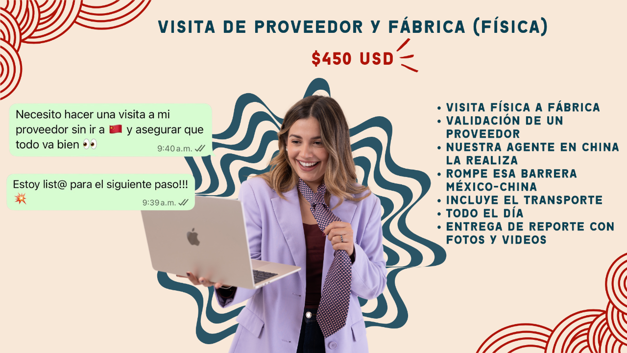 Judy es nuestra agente en China, y la encargada de todas nuestras visitas, tanto presenciales como online en el país. No solamente eso, también se asegura que todas tus dudas respecto al producto y proveedor sean contestadas. Valida que la calidad sea buena, lo que tu buscas. Junto con nuestro equipo aquí en México, trabajamos de la mano para brindarte el mejor servicio.